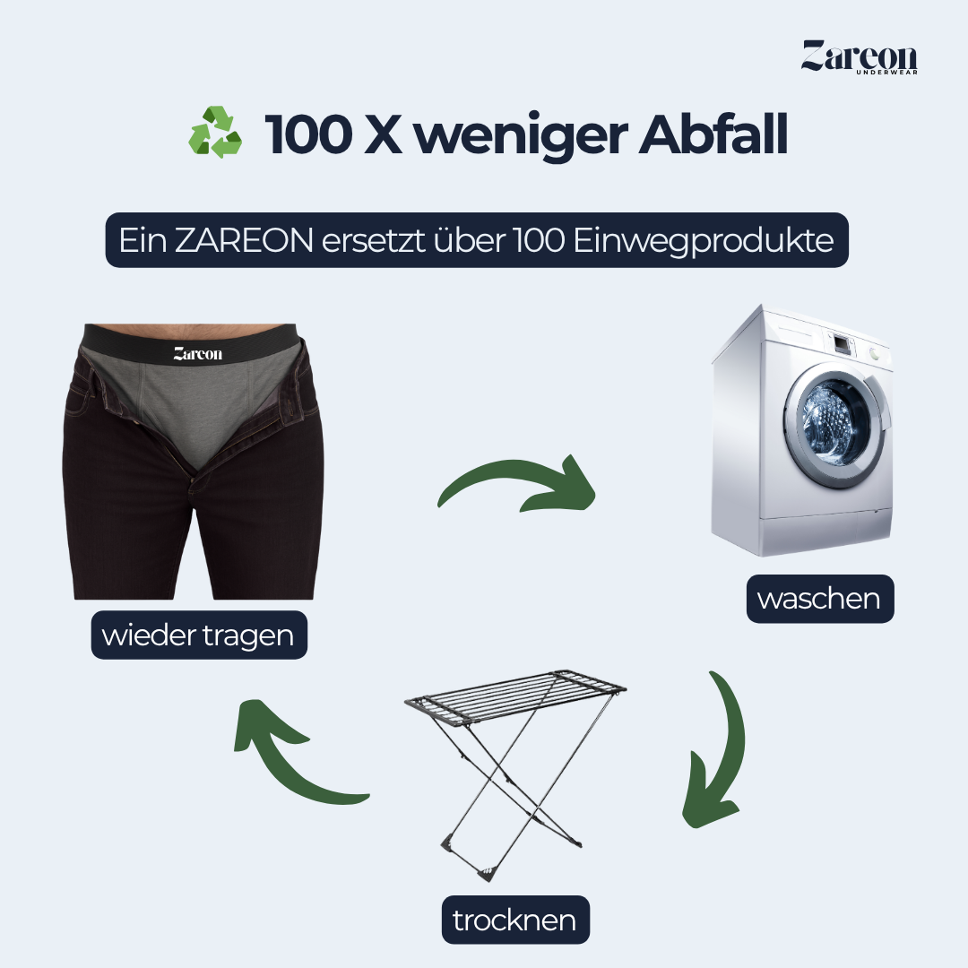 Unsere Boxer ersetzen hunderte Einwegprodukte und stehen für weniger Müll und mehr Bewusstsein.Waschbar. Langlebig. Und gut – für dich und den Planeten.