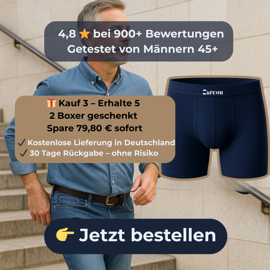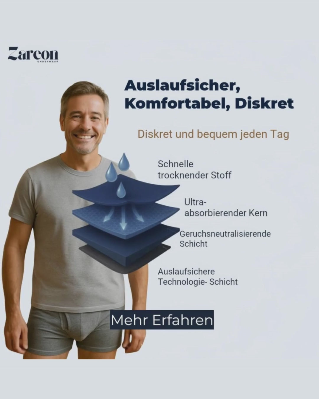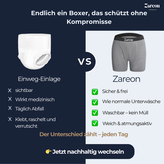 Zareon Boxer sehen aus wie klassische, hochwertige Herrenunterwäsche – bieten aber einen entscheidenden Vorteil: Sie schützen dich zuverlässig vor Auslaufen, ohne dass jemand etwas bemerkt.